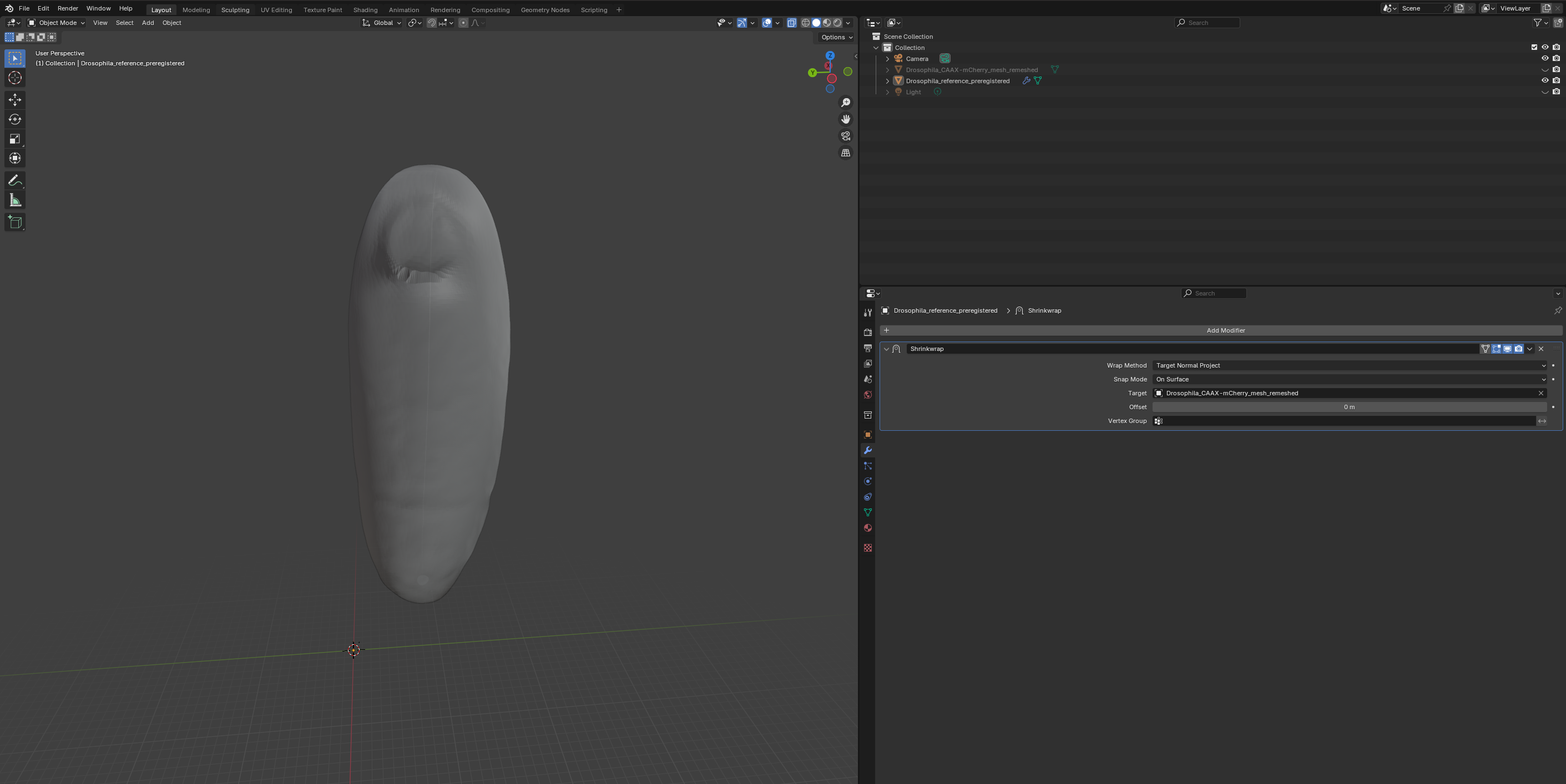 If things look good, click “Apply” to make the modifier permanent and export the mesh as Drosophila_reference_wrapped.obj.