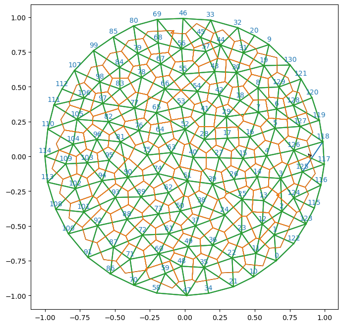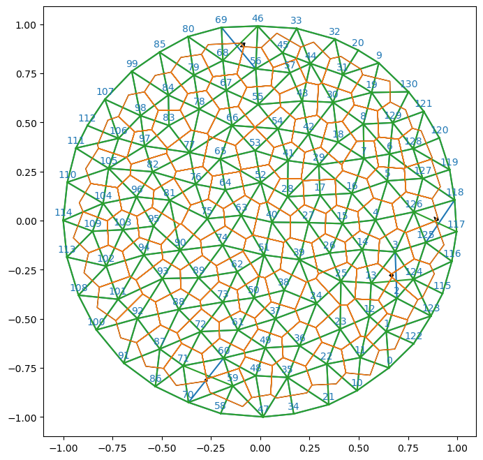 # you can see the flipped edge between vertices 126-117 in the plot below (middle right)fig = plt.figure(figsize=(8,8))plt.triplot(*geommesh.vertices.T, hemesh.faces)plt.triplot(*flipped_geommesh.vertices.T, flipped_hemesh.faces)ax = plt.gca()p1 = msh.cellplot(hemesh, geommesh.face_positions, cell_colors=np.array([0.,0.,0.,0.]), mpl_polygon_kwargs={"lw": 1, "ec": "k"})p2 = msh.cellplot(flipped_hemesh, flipped_geommesh.face_positions, cell_colors=np.array([0.,0.,0.,0.]), mpl_polygon_kwargs={"lw": 1, "ec": "tab:orange"})ax.add_collection(p1)ax.add_collection(p2)plt.axis("equal")msh.label_plot(geommesh.vertices, hemesh.faces, fontsize=10, face_labels=False)