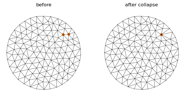 # test on the existing example mesh. pick some interior, unique half-edgecandidates = np.where(np.asarray(hemesh.is_unique & (~hemesh.is_bdry_edge)))[0]e_collapse = candidates[40]print("Collapsing half-edge", e_collapse, "with vertices", int(hemesh.orig[e_collapse]), int(hemesh.dest[e_collapse]))hemesh_collapsed, remap = collapse_edge(hemesh, e_collapse,)vertices_collapsed = geommesh.vertices[remap.v_reverse]