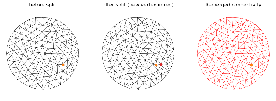 Next, let’s create the opposite operation - splitting a vertex into two. To do so, we need to specify two half-edges, the “splitting axis”, which meet at a common vertex. Like before, we also need a map of how hold and new mesh elements are related. We append the newly created mesh elements at the end of the different arrays.